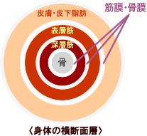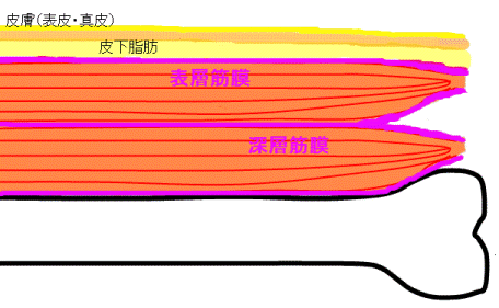 【筋膜(fascia)】は、主に筋肉を被っている膜のことをさしますが、靭帯・腱・骨・臓器も被う分厚い結合組織を意味します。 【筋膜(fascia)】とは何か? 数年前までは、MRIやX線、超音波では骨や筋肉しか観察することができませんでしたが、近年、超音波の技術の進歩により画像として観察することが可能になってきました。ヨーロッパの医師の中には、超音波画像により筋膜病変の診断を下している医師もいらっしゃると聞きます。また、フランスの研究チームは、マイクロスコープでの撮影に成功し、【筋膜(fascia)】には無数の神経細胞(受容器や自由神経終末)が分布していることを発見しました。これらの発見により、【筋膜(fascia)】は生きている(自立している)のだと言うことが証明されたのです。
